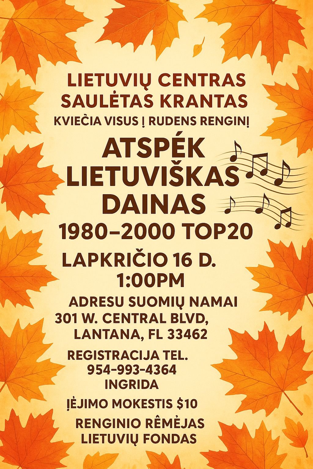 November 16, 2025 @ 1:00 pm RUDENS MUZIKINIS RENGINYS. ATSPĖK LIETUVIŠKĄ DAINĄ! Lapkričio 16 d. Durys atidaromos: 1:00 PMPradžia: 2:00 PMVieta: Suomių namai, 301 W Central Blvd, Lantana, FL, United States, 33462Kviečiame visus!Dvi spėjančiųjų komandos po 5 dalyviusLinksmas, azartiškas žaidimas.Įtraukiama ir žiūrovų publika – palaikymas reikalingas!Dalyvavimo sąlygos:Komandos nariui – $15Laimėjusi komanda susigrąžina savo įnašą + gauna pralaimėjusių komandos […]