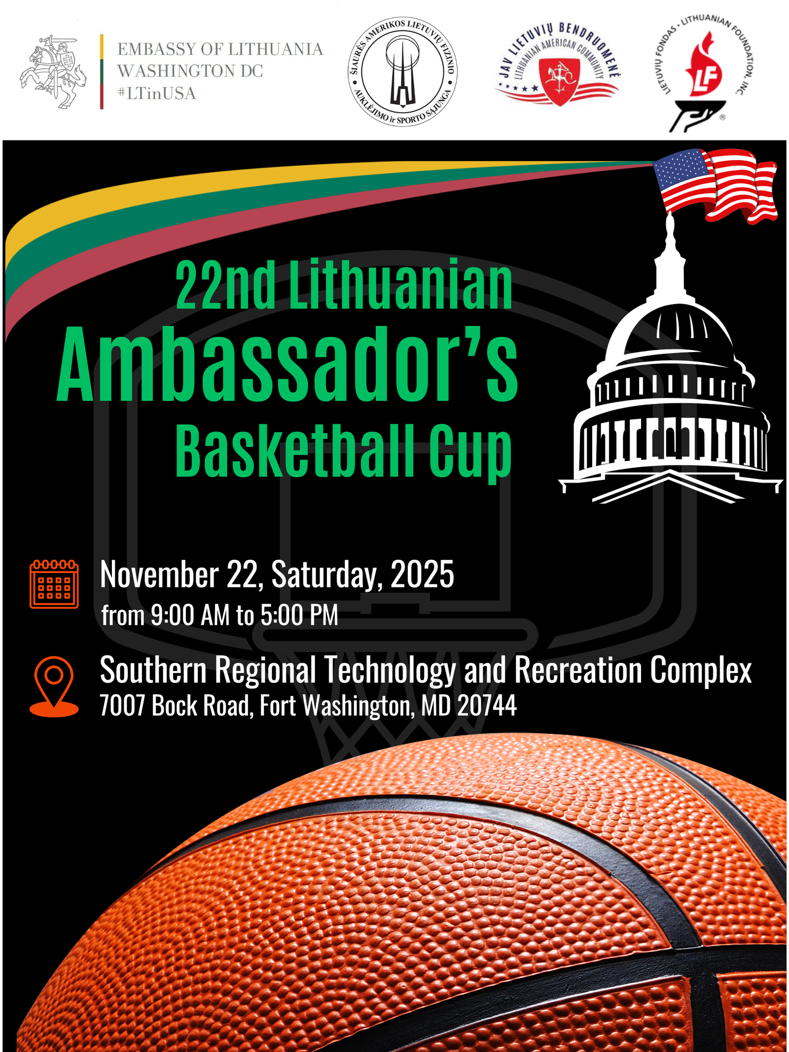 November 22, 2025 @ 9:00 am - 5:00 pm 22-asis Lietuvos Ambasadoriaus taurės krepšinio turnyras.Lietuvos ambasada Vašingtone ir Šiaurės Amerikos Lietuvių Fizinio Auklėjimo Sporto Sąjunga (ŠALFASS) tęsia ilgametę bei sėkmingą krepšinio turnyro tradiciją ir jau 22-ąjį kartą rengia Lietuvos Ambasadoriaus taurės 5x5 formato krepšinio turnyrą.Turnyras vyks 2025 m. lapkričio 22 d., šeštadienį, nuo 9:00 val. […]