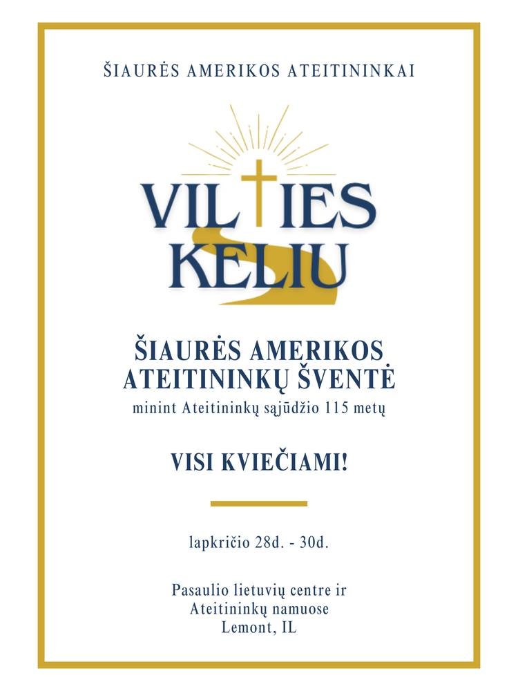 November 28, 2025 @ 9:00 am - November 30, 2025 @ 1:00 pm ŠIAURĖS AMERIKOS ATEITININKŲ ŠVENTĖminint ateitininkų sąjūdžio 115 metų.Kviečiame į išskirtinį savaitgalį 2025 m. lapkričio 28-30 d. Lemont, Illinois, Pasaulio Lietuvių centre ir Ateitininkų namuose. Jūsų laukia įdomios temos, gyvos diskusijos, puikios vakarinės programos ir Lino Adomaičio koncertas. Informaciją ir registraciją rasite čia […]