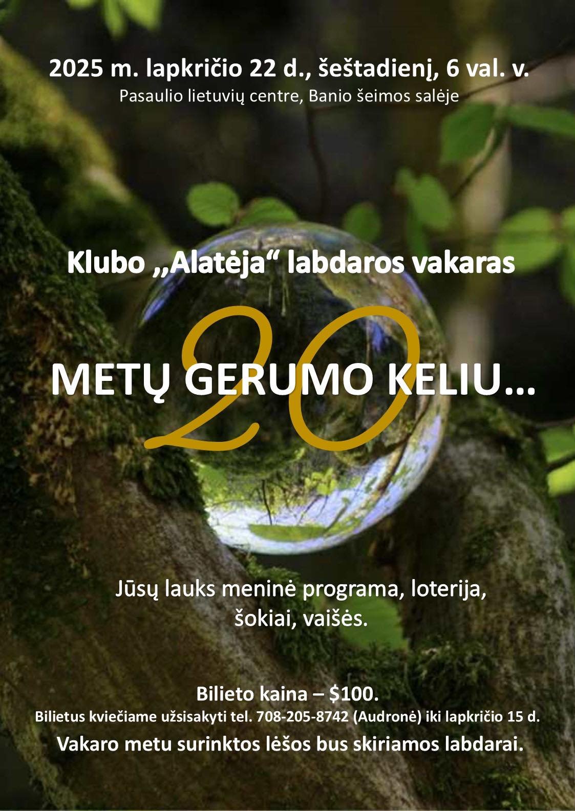 November 22, 2025 @ 6:00 pm Klubo „Alatėja" labdaros vakaras "20 METŲ GERUMO KELIU..." 2025 m. lapkričio 22 d., šeštadienį, 6 val. v. Pasaulio lietuvių centre, Banio šeimos salėje. Jūsų lauks meninė programa, loterija, šokiai, vaišes. Bilieto kaina - $100. Bilietus kviečiame užsisakyti tel. 708-205-8742 (Audronė) iki lapkričio 15 d. Vakaro metu surinktos lėšos bus […]