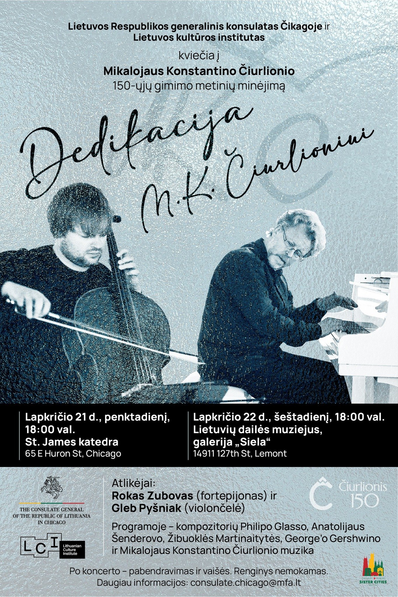November 22, 2025 @ 6:00 pm M. K. Čiurlionio 150-ųjų gimimo metinių koncertasDedikacija Čiurlioniui Generalinis konsulatas Čikagoje ir Lietuvos kultūros institutas / Lithuanian Culture Institute kviečia paminėti Mikalojaus Konstantino Čiurlionio 150-ąsias gimimo metines Čikagoje!Pianistas Rokas Zubovas ir violončelininkas Gleb Pyšniak atliks specialiai šiai sukakčiai parengtą programą, kurioje skambės Philip Glass, Žibuoklės Martinaitytės, Anatolijaus Šenderovo, George’o Gershwino […]