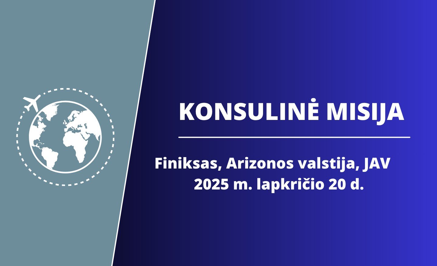 November 20, 2025 @ 9:00 am - 6:00 pm Konsulinė misija. Phoenix, AZLapkričio 20 d. Lietuvos konsuliniai pareigūnai teiks konsulines paslaugas Finikso mieste, Arizonos valstijoje.Konsulinė misija vyks adresu: bus paskelbta vėliau.Asmenys lapkričio 20 d. (ketvirtadienį) bus priimami nuo 09.00 iki 18.00 val., Konsulinės misijos metu bus aptarnaujami tik iš anksto užsiregistravę ir registracijos patvirtinimą gavę […]