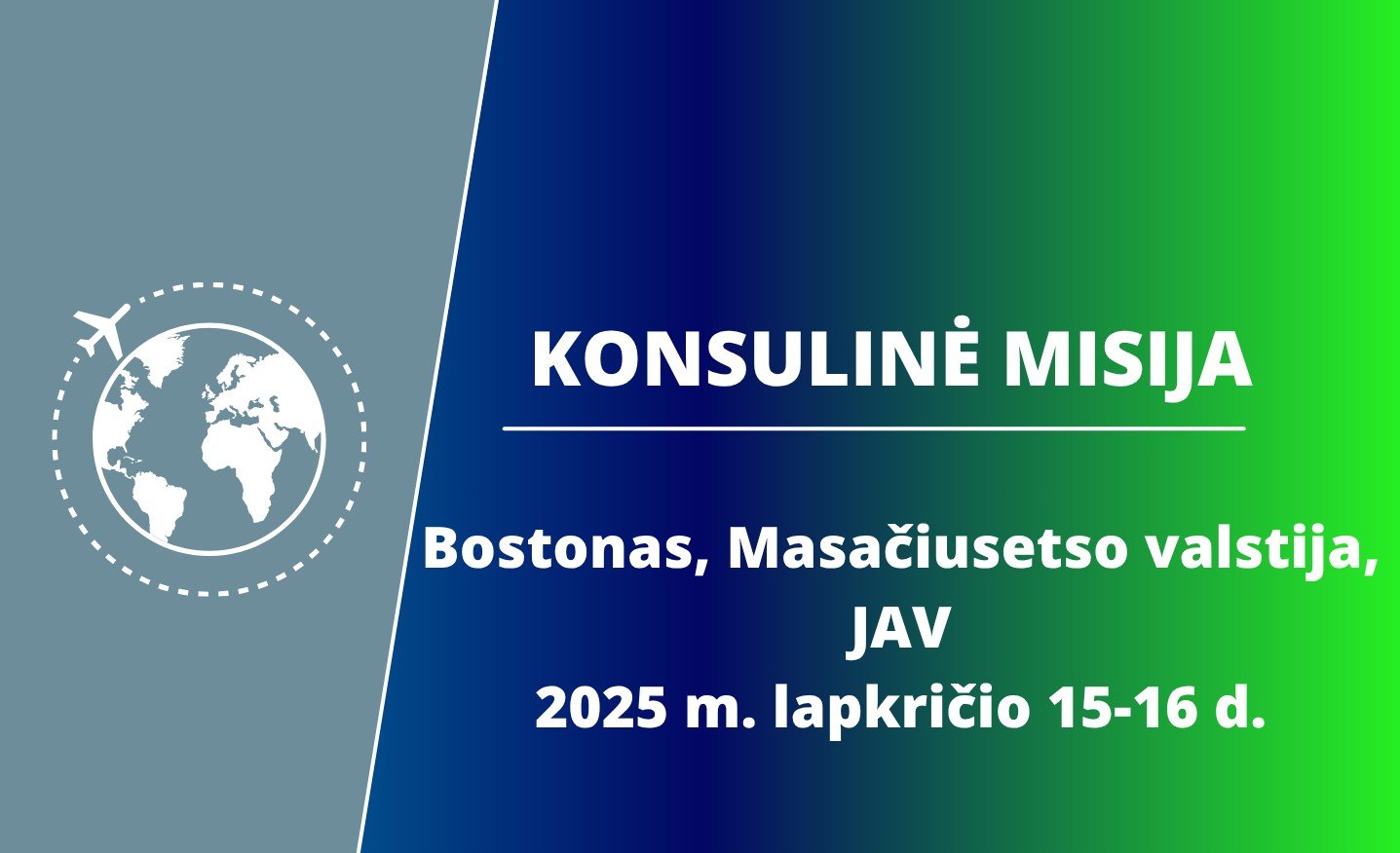 November 15, 2025 - November 16, 2025 Konsulinė misijaKonsulinė misija Bostone!Lapkričio 15-16 d. Lietuvos konsuliniai pareigūnai teiks konsulines paslaugas Bostono mieste, Masačiusetso valstijoje.Konsulinė misija vyks Kredito unijos "Taupa" patalpose adresu: 368 W Broadway, South Boston, MA 02127.Asmenys lapkričio 15 d. (šeštadienį) bus priimami nuo 09.00 iki 18.00 val., lapkričio 16 d. (sekmadienį) – nuo 09.00 […]