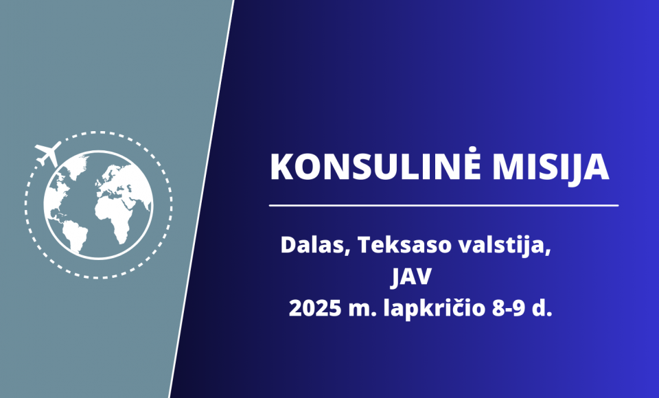 November 8, 2025 - November 9, 2025 Išvažiuojamoji konsulinė misija DallasLietuvos Respublikos generalinis konsulatas Čikagoje kviečia Lietuvos piliečius registruotis į konsulinę misiją Dalase, kurios metu bus teikiamos šios paslaugos:✅ Paso ir (ar) asmens tapatybės kortelės išdavimas / keitimas✅ Gyvenamosios vietos deklaracija (išvykus iš Lietuvos >6 mėn.)✅ Pranešimai apie prarastus asmens dokumentus✅ Santuokos, gimimo, mirties įtraukimai […]