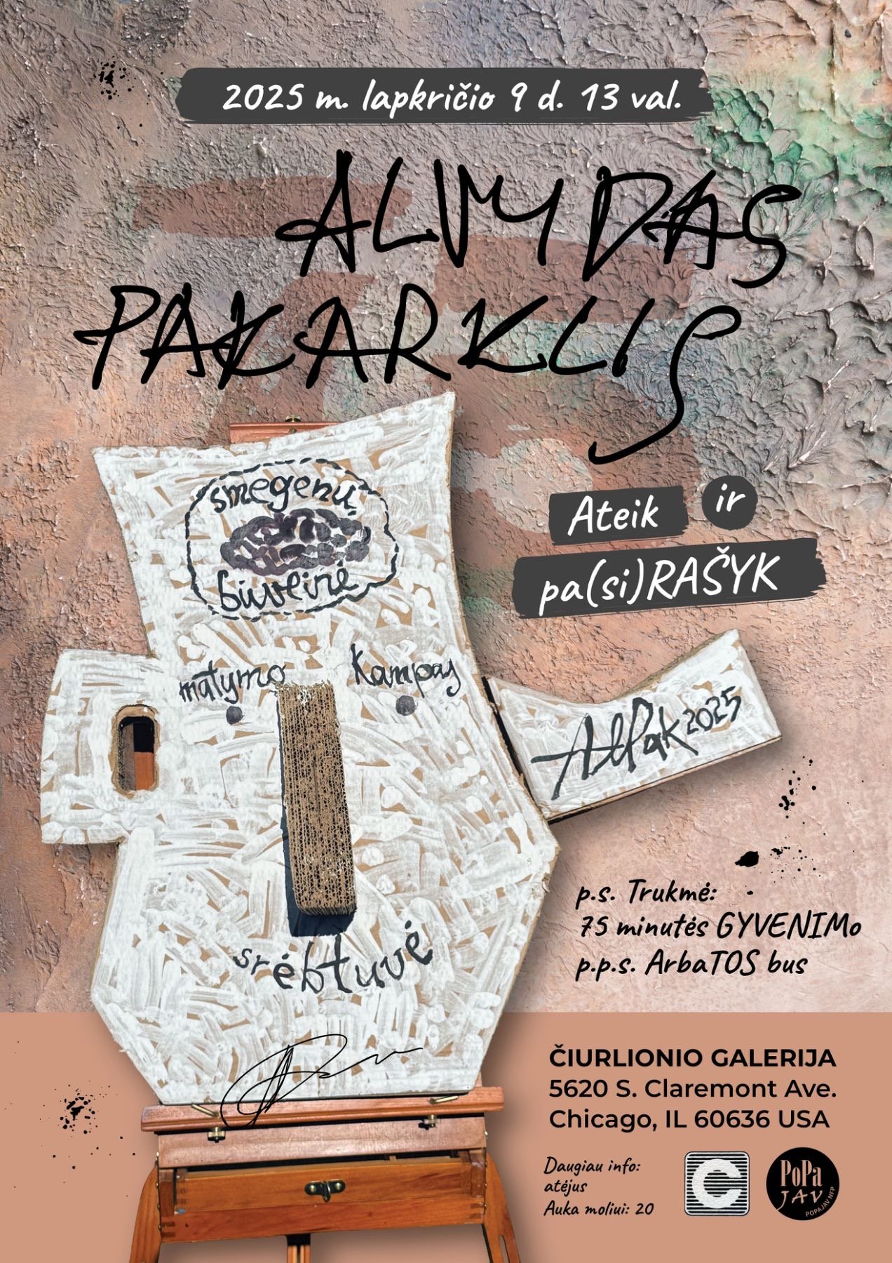 November 9, 2025 @ 1:00 pm Alvydas Pakarklis "Ateik ir pa(si)rašyk". Chicago, ILPakarklis Alvydas Jonas 1950 11 09 Uliesis (Panevėžio rj.), lietuvių keramikas. 1977 baigė Lietuvos dailės institutą (mokėsi pas J. Adomonį). 1978–91 dirbo Panevėžio stiklo fabrike, čia 1983 įkūrė aukštos temperatūros keramikos degimo krosnį, kuria naudojasi Lietuvos ir užsienio šalių keramikai. Respublikinių keramikos seminarų vienas rengėjų (nuo 1983, nuo 1989 […]