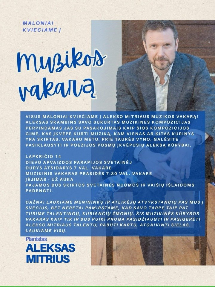 November 14, 2025 @ 7:00 pm Muzikos vakaras. Pianistas Aleksas Mitrius. Southfield, MIMALONIAI KVIEČIAME Į ALEKSO MITRIAUS, MUZIKOS VAKARĄ!ALEKSAS SKAMBINS SAVO SUKURTAS MUZIKINES KOMPOZICIJAS PERPINDAMAS JAS SU PASAKOJIMAIS KAIP ŠIOS KOMPOZICIJOS GIMĖ, KAS ĮKVĖPĖ KURTI MUZIKĄ, KAM VIENAS AR KITAS KŪRINYS YRA SKIRTAS. VAKARO METU, PRIE TAURĖS VYNO, GALĖSIT PASIKLAUSYTI IR POEZIJOS POSMŲ ĮKVĖPUSIŲ ALEKSĄ […]